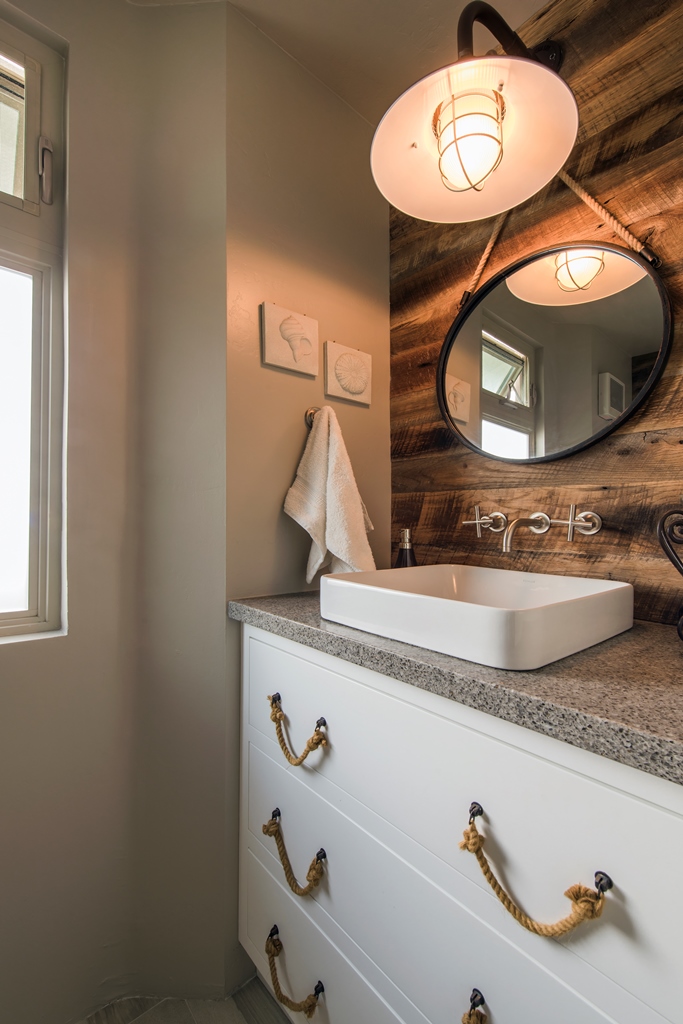 While Lorrie kept with the cabinet theme from the kitchen, and maintained consistent wood-look tile flooring throughout, there are many features and finishes that set this bathroom apart from an ordinary powder bathroom: